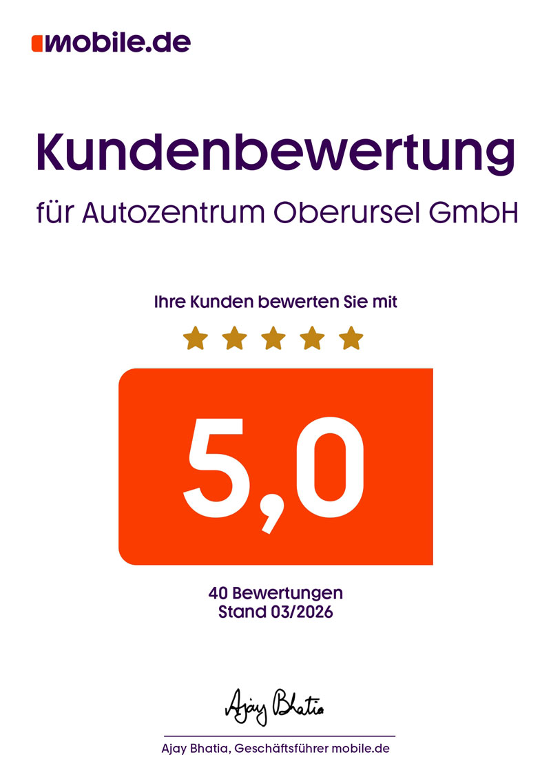 Service- und Kundenorientiertheit werden bei uns groß geschrieben. Als anerkannter Automobildienstleister steht Ihnen unser Serviceteam jederzeit und kompetent zur Verfügung. Unsere Online-Plattform www.mobile.de/AUTOZENTRUM-OBERURSEL bildet den Kern des Geschäftsfelds Online Retail (Privat- und Gewerbekundenfinanzierungen)